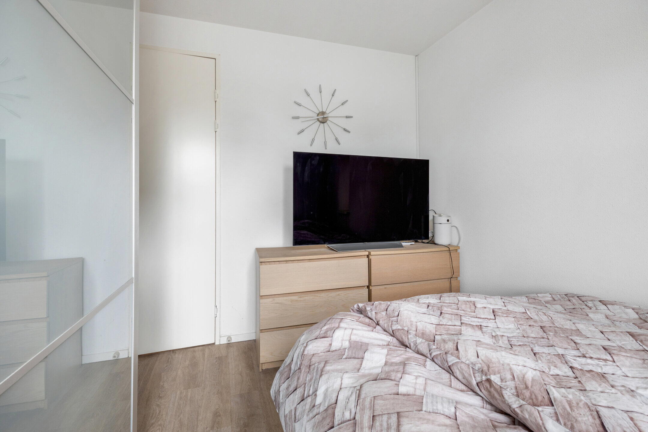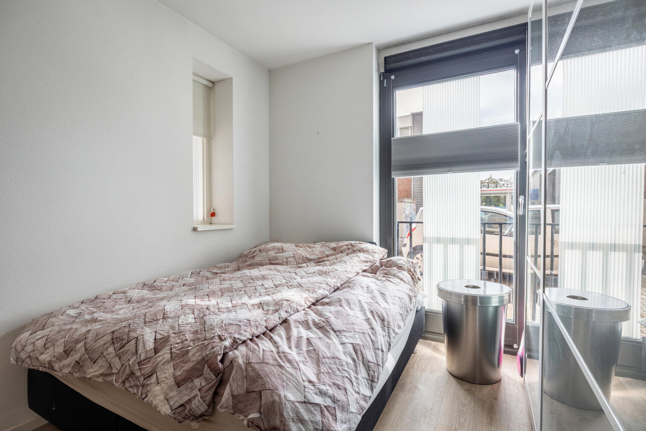 De slaapkamer (ca. 3.34 x 2.93m) is voorzien van een pvc-vloer, vloerverwarming en een geheel te openen kamerhoge raampartij met Frans balkon.