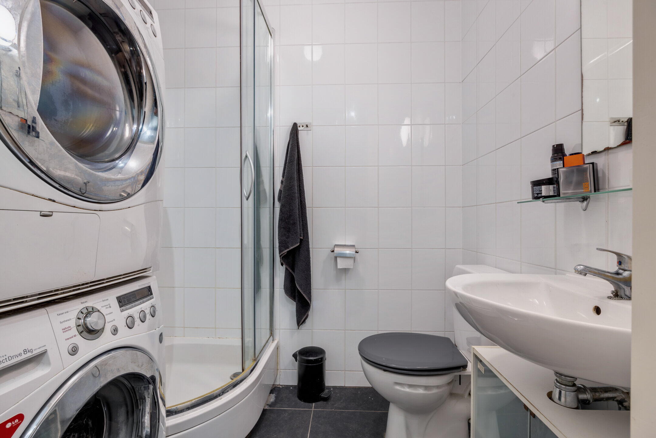 De geheel betegelde badkamer (ca. 2.05 x 1.60m) beschikt over een douchecel, toilet, wastafel, mechanische afzuiging en tevens vinden we hier de aansluitpunten ten behoeve van de wasapparatuur.