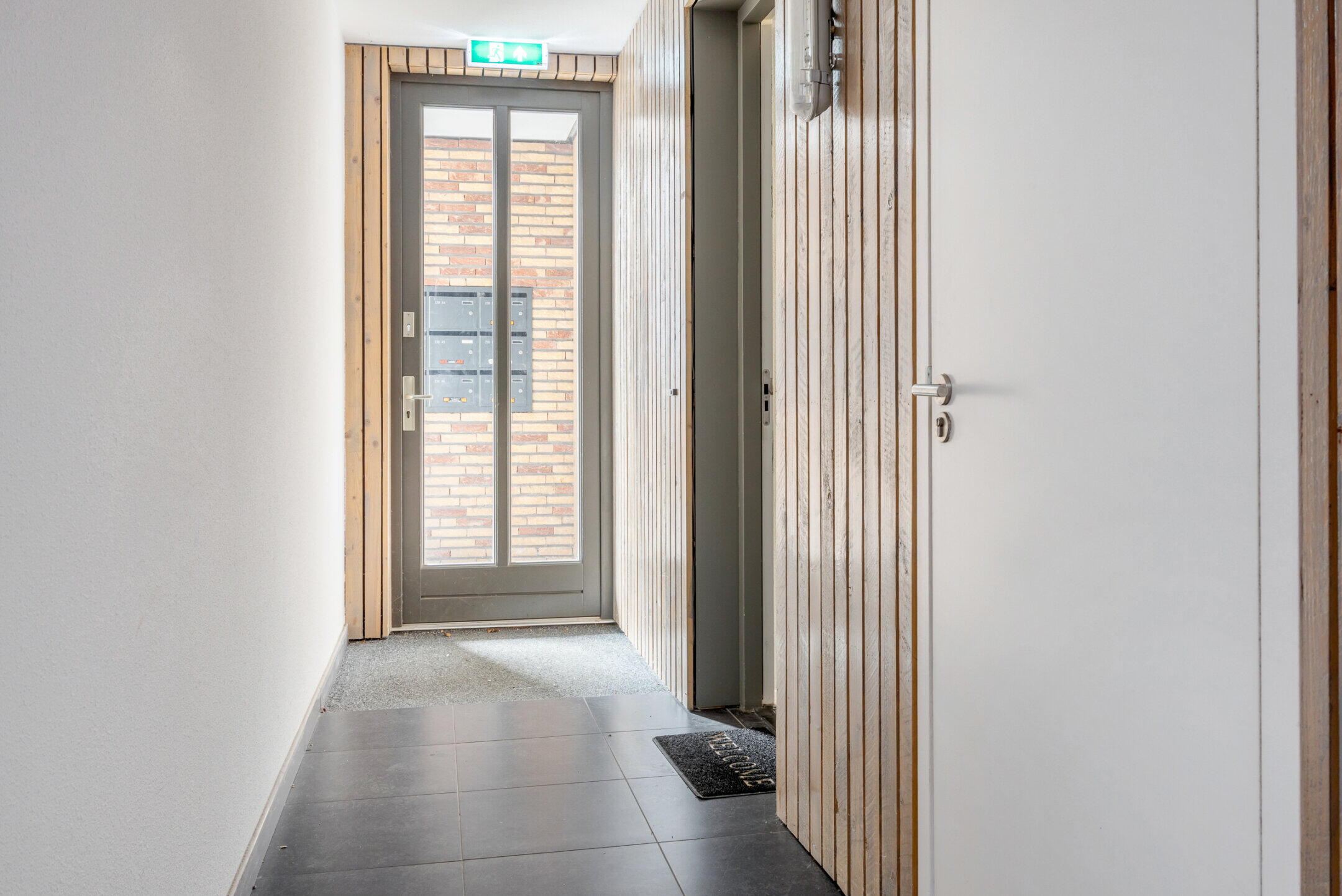 De centrale entree met de brievenbussen en het bellentableau met videofoon geeft toegang tot de centrale hal met toegang tot het appartement gelegen op de begane grond.