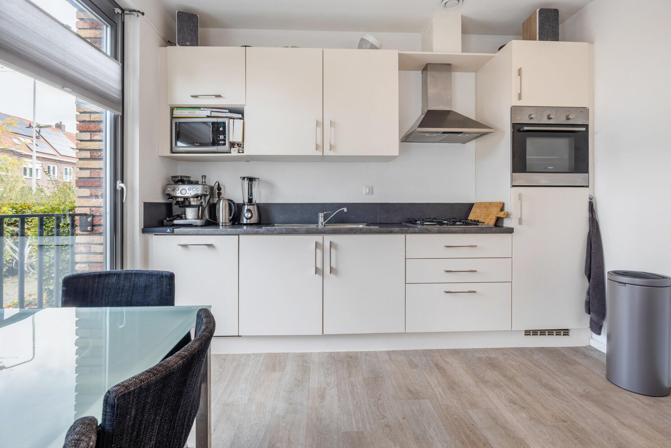 De open keuken in een wandopstelling beschikt over voldoende onder- en bovenkastruimte en diverse inbouwapparatuur waaronder een 4-pits gaskookplaat, rvs afzuigschouw, heteluchtoven, vaatwasser, een koel/vriescombinatie en een rechte spoelbak. De keuken is eveneens afgewerkt met een pvc-vloer, voorzien van vloerverwarming en beschikt over mechanische afzuiging